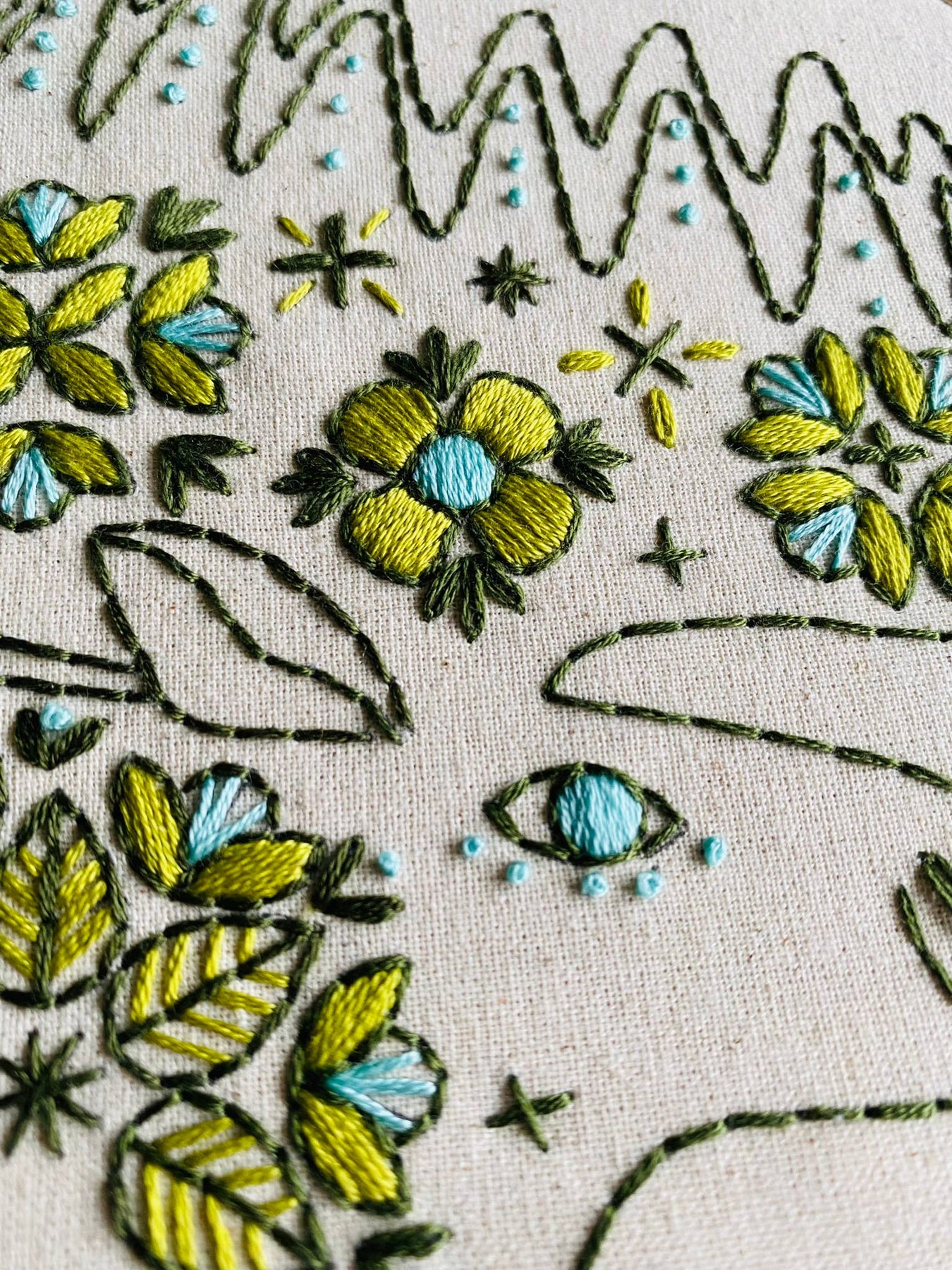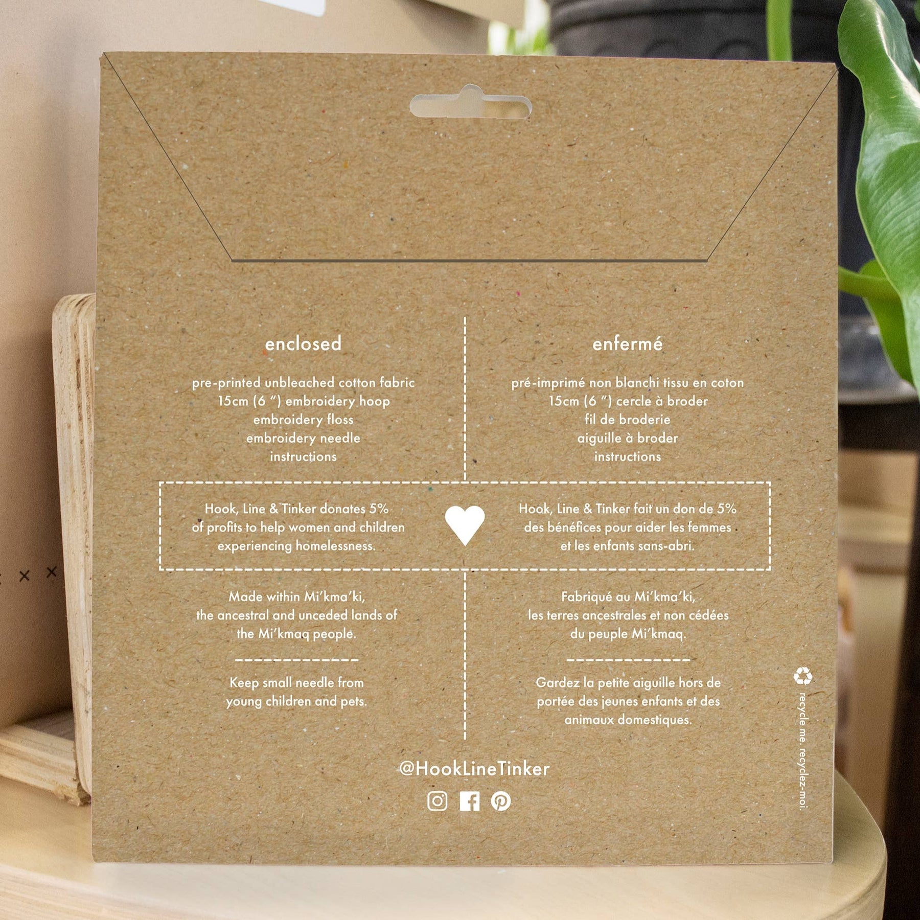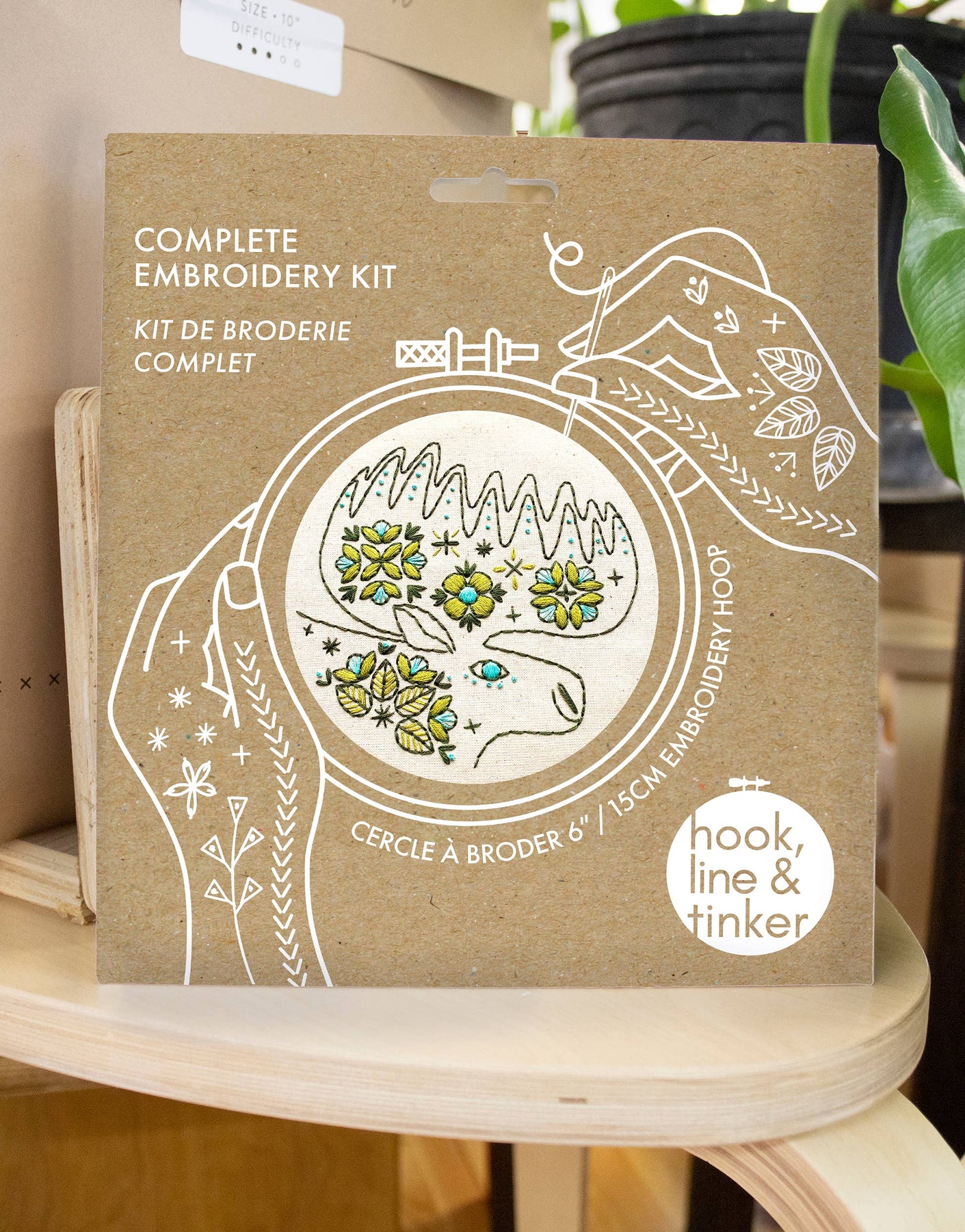 Our Folk Moose pattern in Colour has a unique tonal palette of 3 bold colours and features a sampler combination of satin, link, back stitch and French knots. Craft kit Includes: pre-printed pattern on unbleached cotton fabric 15cm (6”) embroidery hoop embroidery floss (5 full skeins) BOHIN size 3 embroidery needle instructions in ENGLISH and FRENCH Ambitious Beginner Friendly Approximate package dimensions: 8 3/4” x 8” x 3/8” 22cm x 20cm x 1cm Welcome to our new packaging! It's a medium weight boxboard envelope with a convenient built-in hang tab (we're plastic free!). Bilingual English and French.