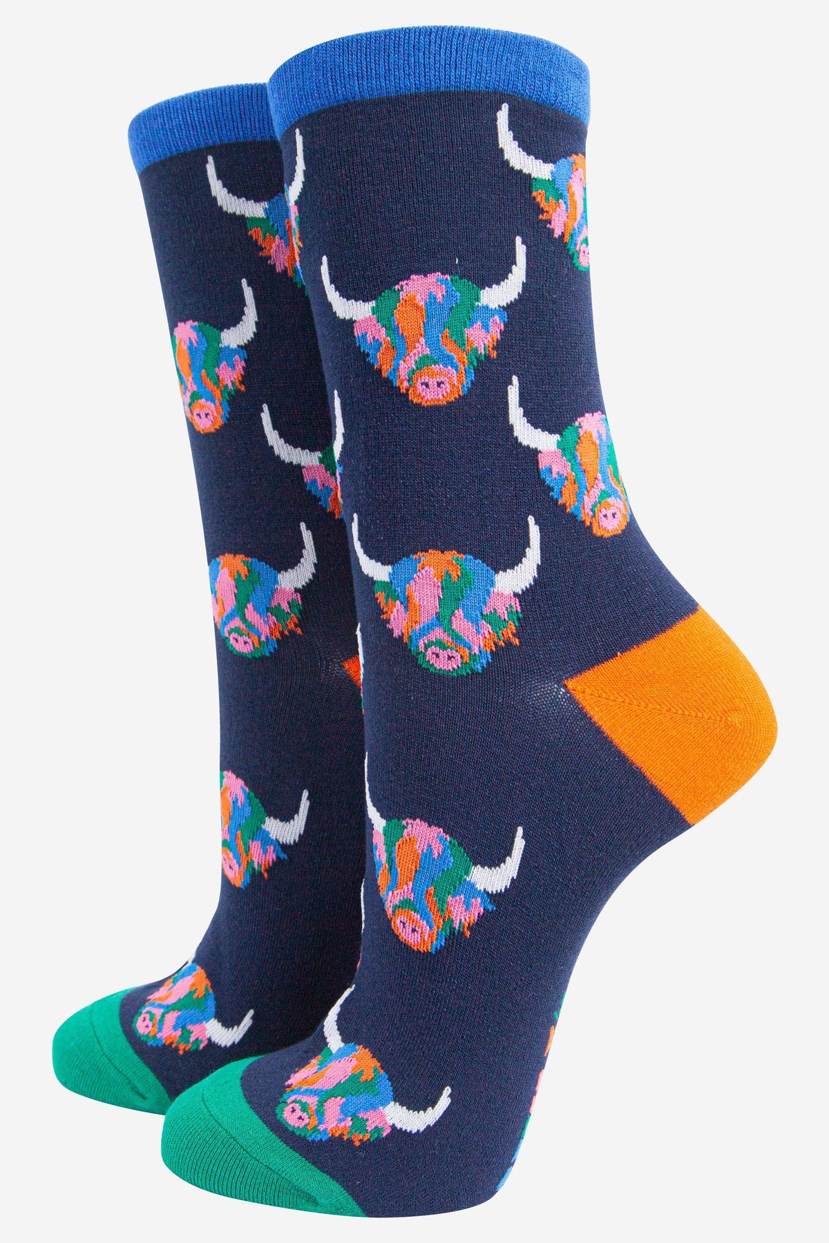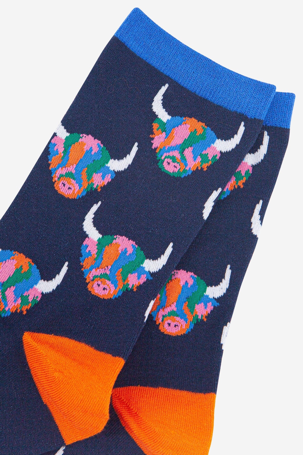 Women's Rainbow Highland Cow Print Bamboo Socks in Navy Blue
