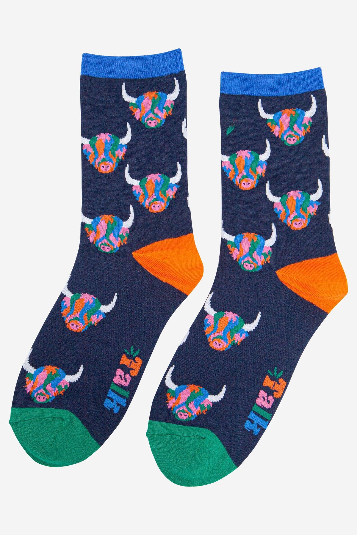 Women's highland cow themed bamboo socks in fun rainbow colours. * Highland Cow Bamboo Socks * Antibacterial & Antifungal * Hypoallergic & Thermo-regulating * Soft & Breathable * Eco-friendly * 70% Bamboo, 27% Polyester, 3% Elastane * Machine Washable (delicate)
